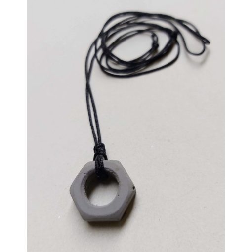 Az anyacsavar fekete selyzsinóron lóg, ami a csúszócsomónak köszönhetően állítható méretű.